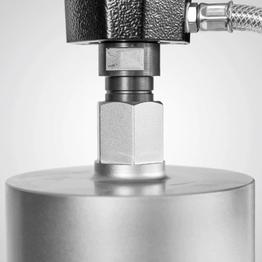 Metalowe złącze z zaworem zapewnia kontrolę przepływu wody podczas wiercenia na mokro.