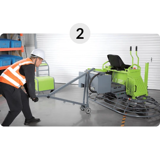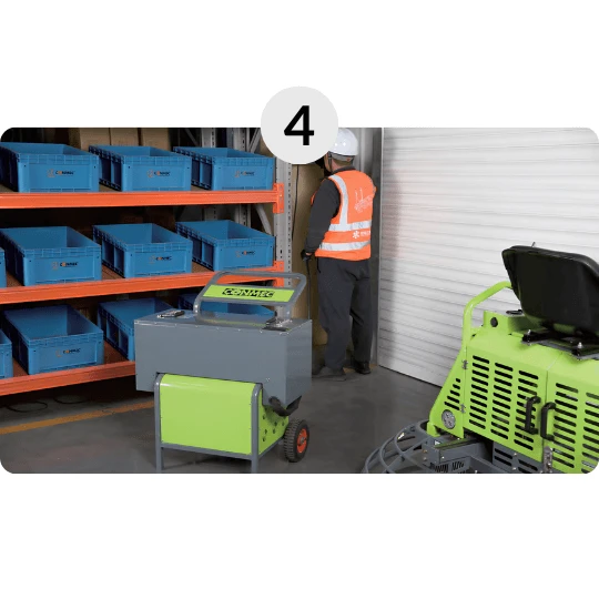 Zintegrowana konstrukcja oraz wózek transportowy umożliwiają wygodne wyjęcie baterii z maszyny przy pomocy prowadnicy. Po jej umieszczeniu na stacji wystarczy podłączyć wtyczkę ładującą i rozpocząć ładowanie – szybko, bezpiecznie i bez użycia narzędzi. Intuicyjna obsługa sprawia, że proces mogą wykonać 1–2 osoby.