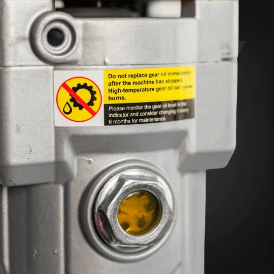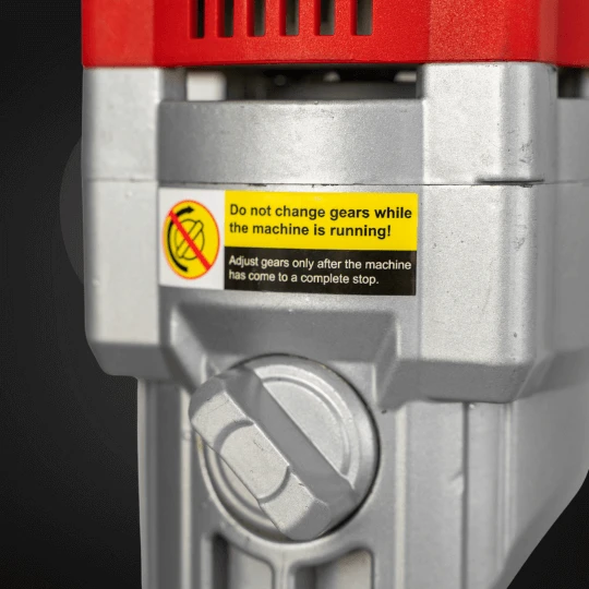 Trzy biegi umożliwiają dostosowanie prędkości obrotowej do średnicy otworu (maks. 250 mm na statywie i 80 mm przy pracy ręcznej). System podwójnego sprzęgła (mechanicznego i elektronicznego) zapewnia bezpieczeństwo operatora i precyzję pracy dzięki miękkiemu rozruchowi oraz ograniczeniu momentu wstecznego.