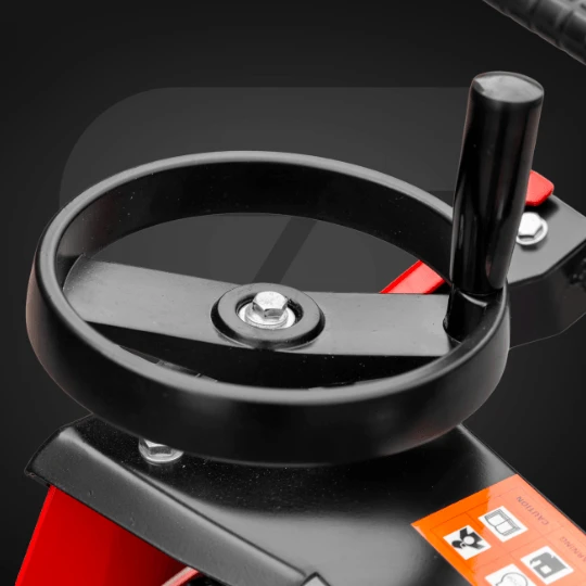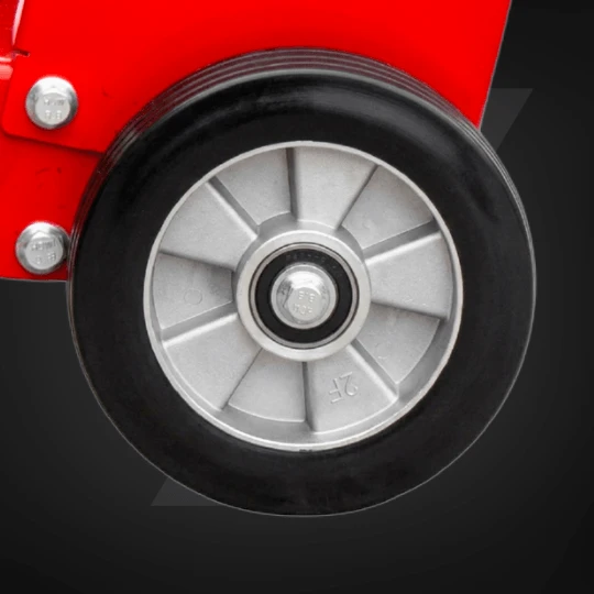 Centralny hak ułatwia przenoszenie maszyny na wyższe kondygnacje, a aluminiowo-gumowe koła stabilizują ją podczas pracy i postoju. Idealna do pracy na piętrach i dużych placach budowy.