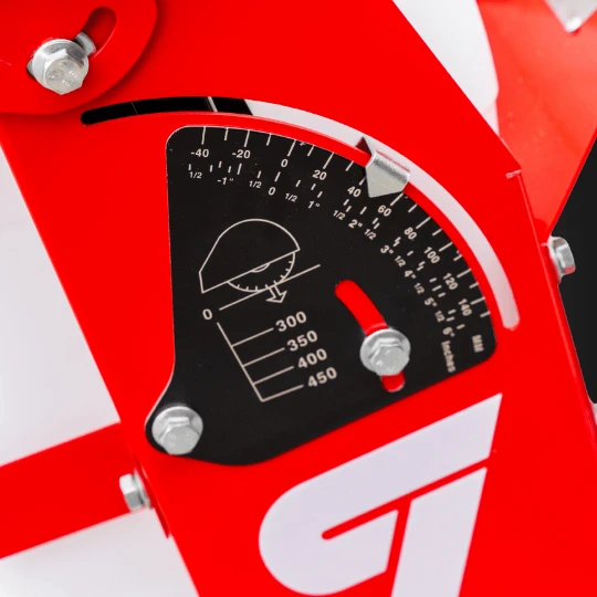 Dzięki płynnej regulacji z amortyzacją oraz systemowi blokad można ustawić głębokość cięcia z wyjątkową dokładnością. Skalowana pod tarcze 350–500 mm — zawsze wiesz, na jakiej głębokości pracujesz.
