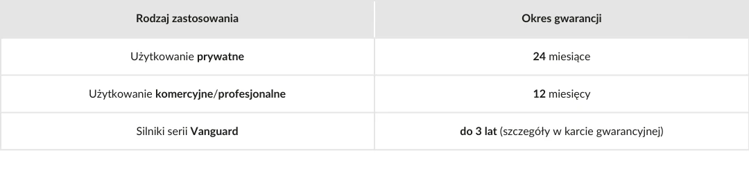 Czas trwania gwarancji zależy od rodzaju silnika oraz sposobu jego użytkowania: