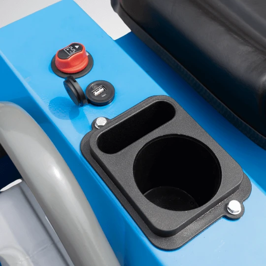 Schowek z uchwytem na kubek i telefon oraz port USB do ładowania urządzeń.